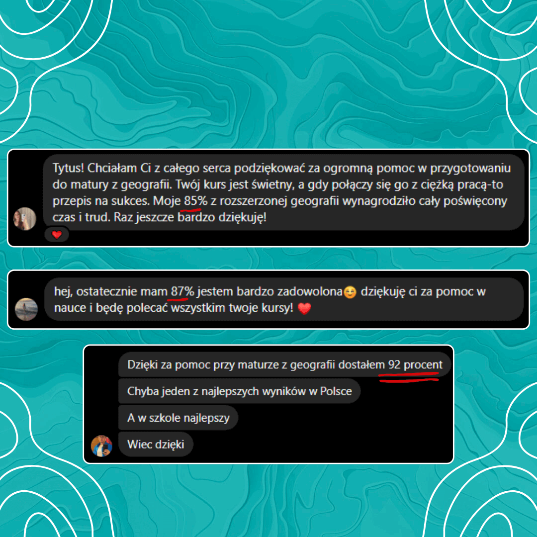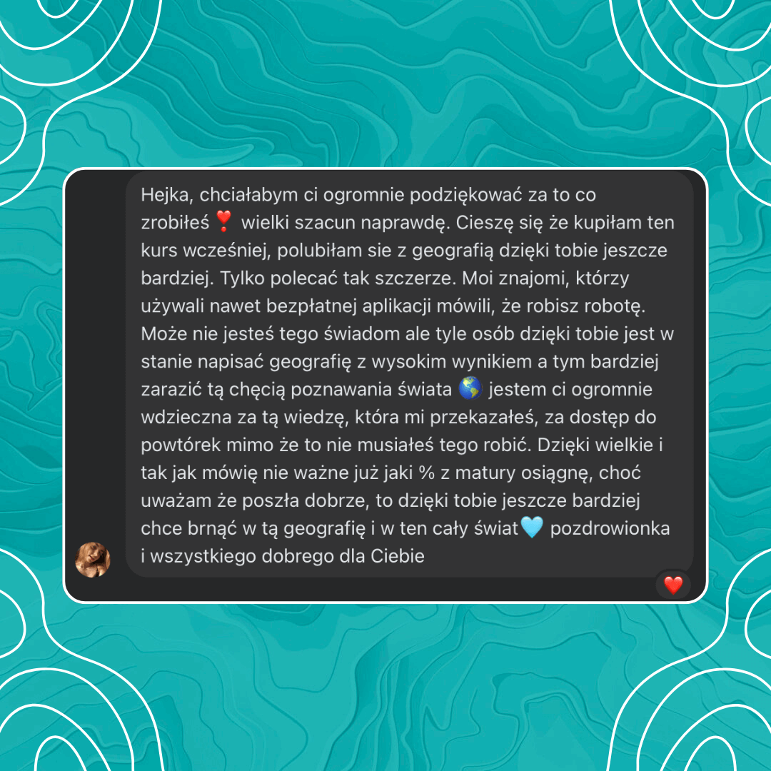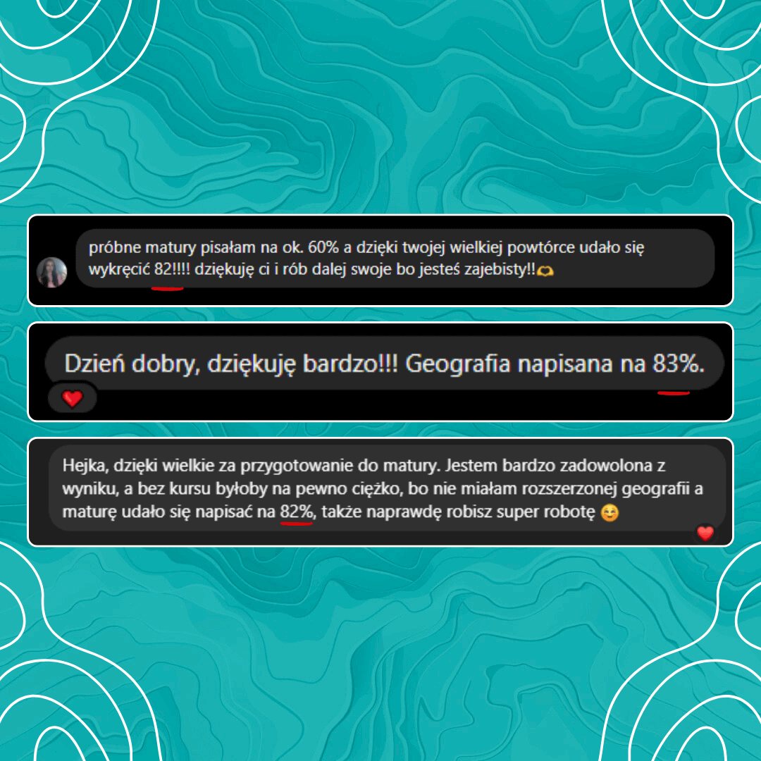 Zamiast wydawać kilka tysięcy złotych na korepetycje czy materiały dodatkowe, otrzymujesz kompletny pakiet w jednym miejscu, a masa wysokiej jakości materiałów, daje Ci pewność świetnego zdania matury z Geografii.