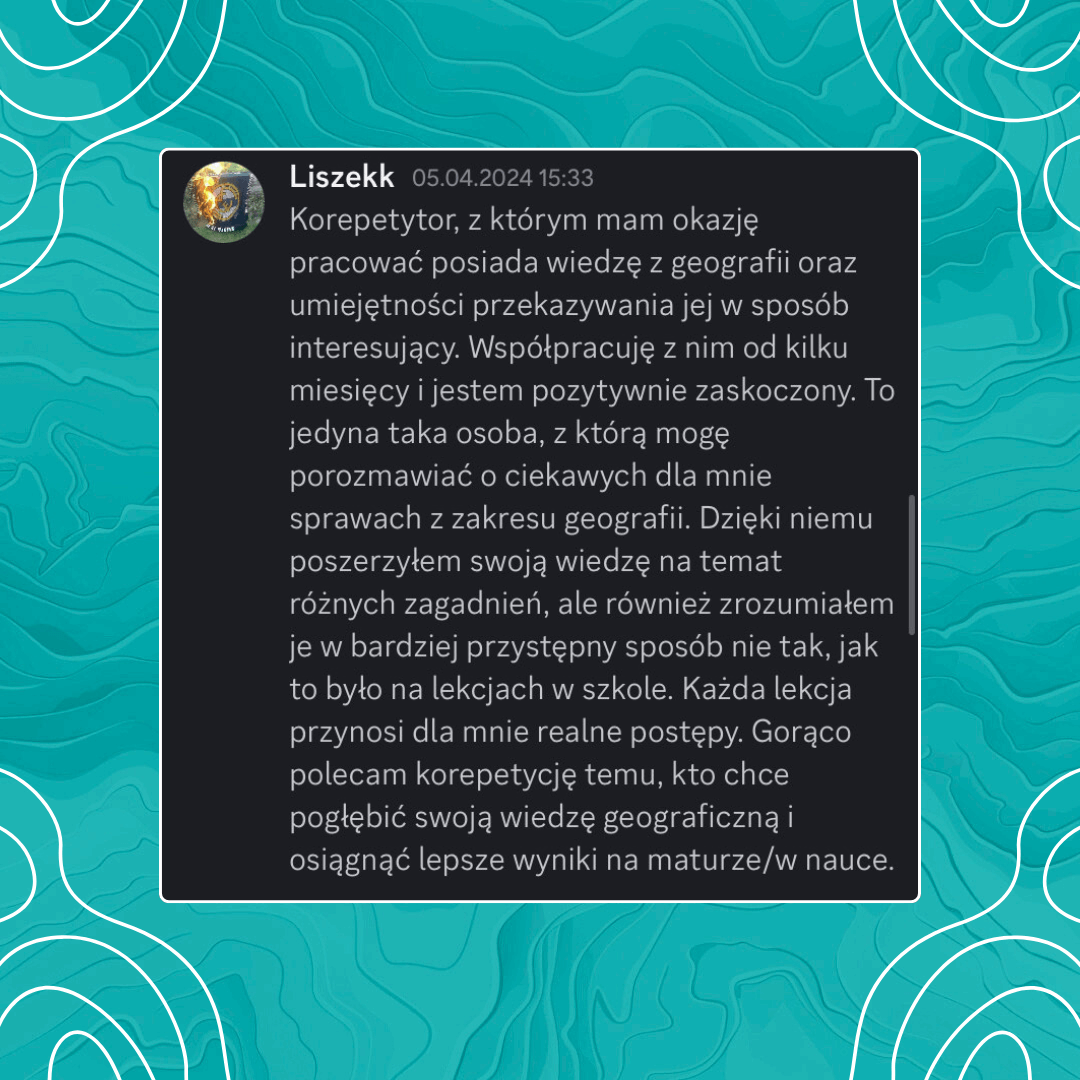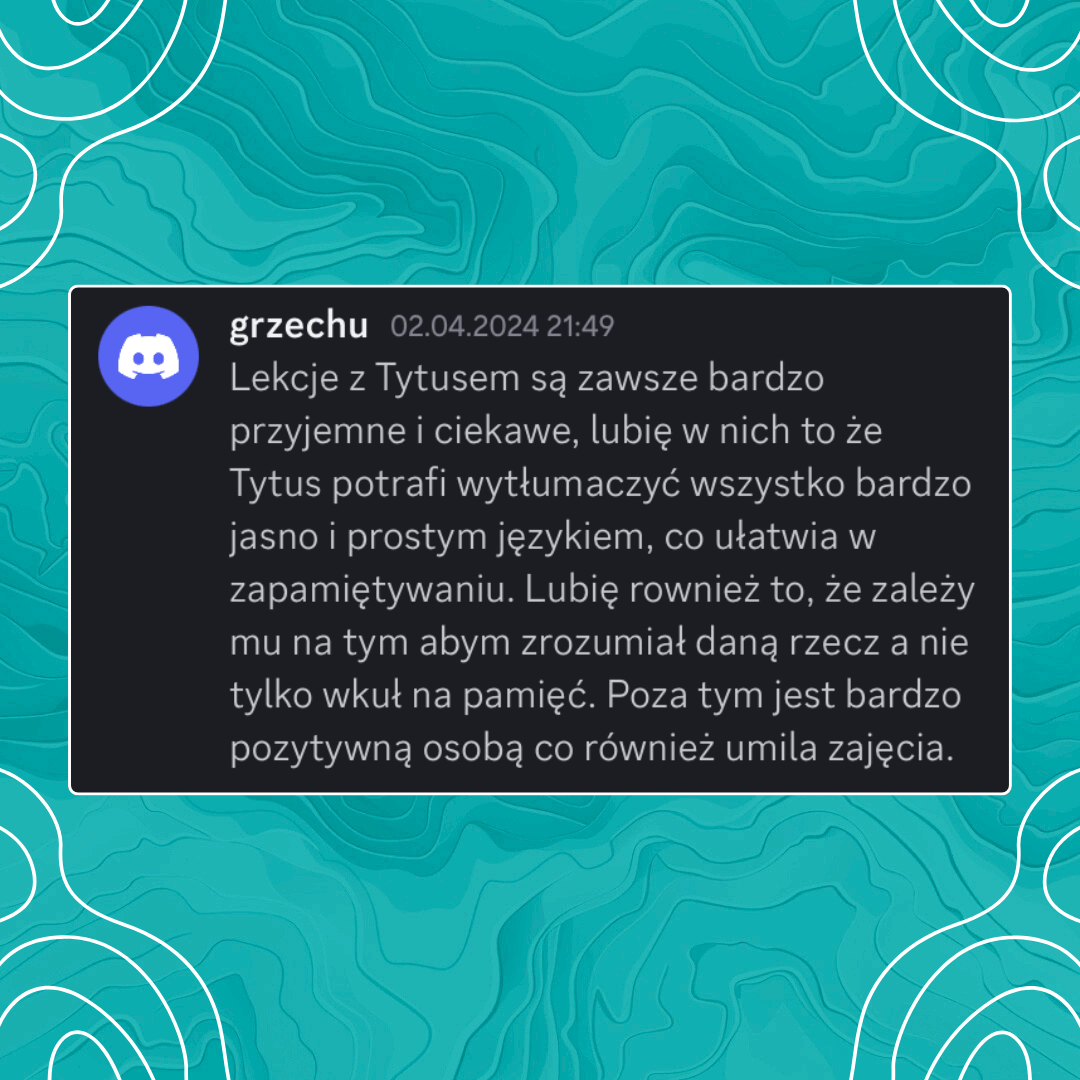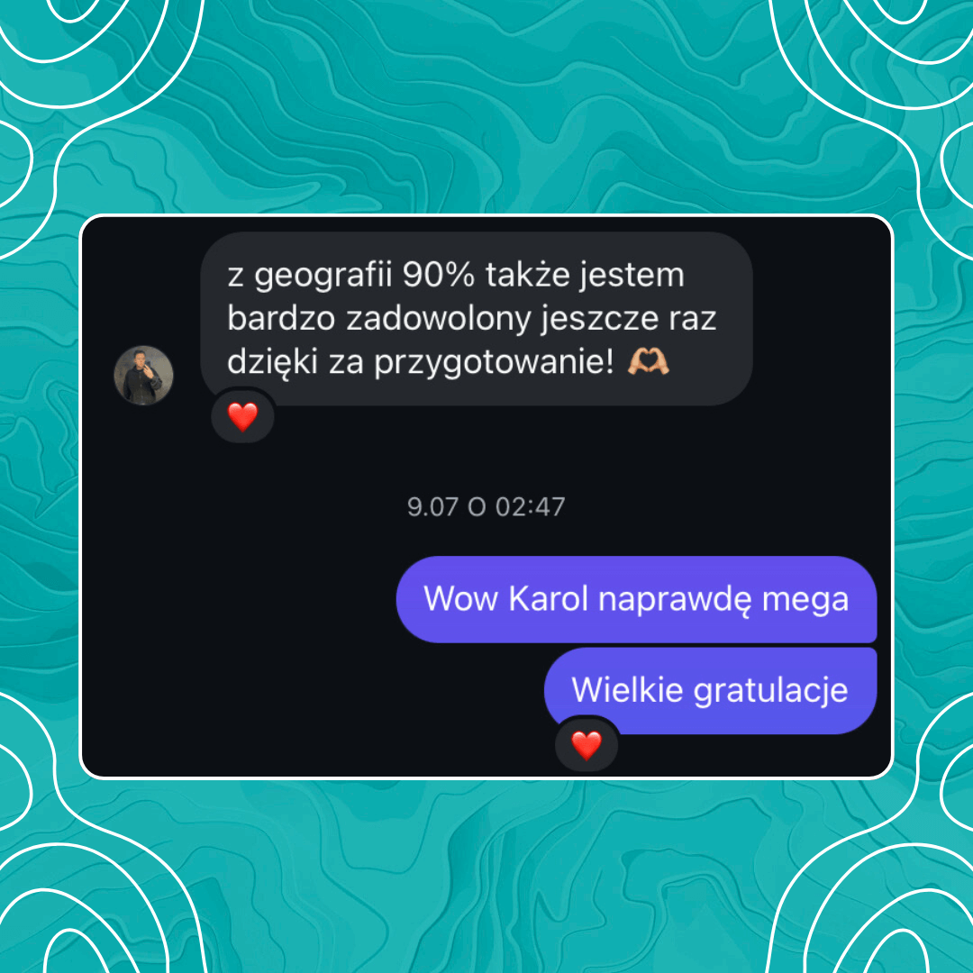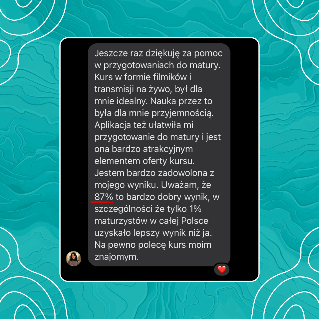 Wyniki i opinie kursantów mówią same za siebie. W pakiecie masz również stały kontakt z prowadzącym – wszystko zaprojektowane tak, aby dać Ci ogromną przewagę w rekrutacji na studia.